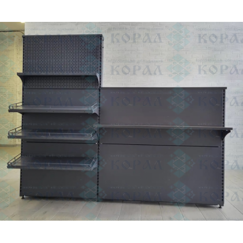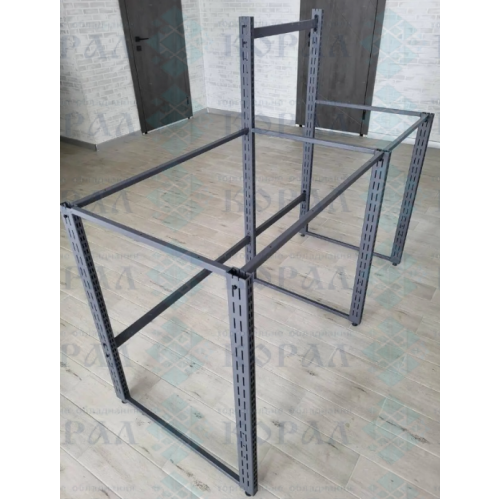 Каркас збірно-розбірний, складається з двох секцій довжиною 665* і 1000* мм. На фронтальній частині касової зони встановлено 4 металеві полиці для імпульсних товарів та одна посилена полиця ДСП для сумки і кошика покупця. Секція касової стійки оснащена перфорованою стінкою для торгових гачків.
