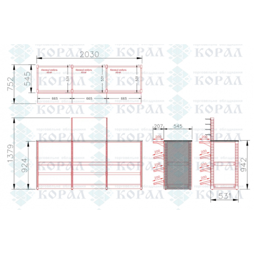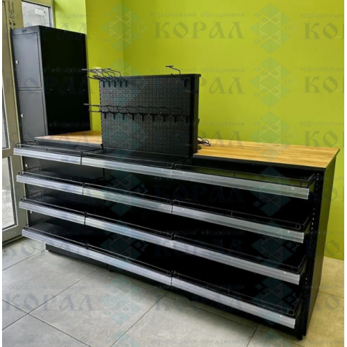 Каркас збірно-розбірний, складається з трьох секцій довжиною по 665 мм (умовний розмір). На фронтальній частині встановлені 4 ряди полиць для імпульсних товарів, а середня секція з касовою стійкою оснащена задньою стінкою з європерфорацією під торгові гачки.